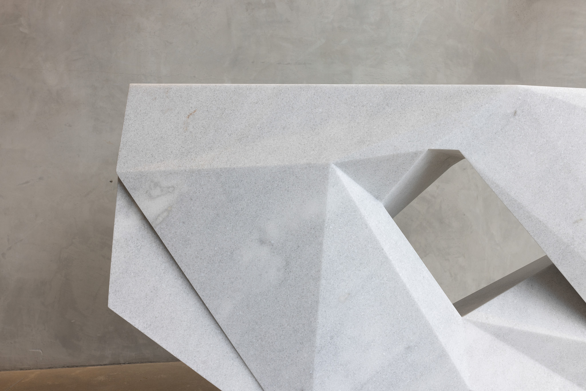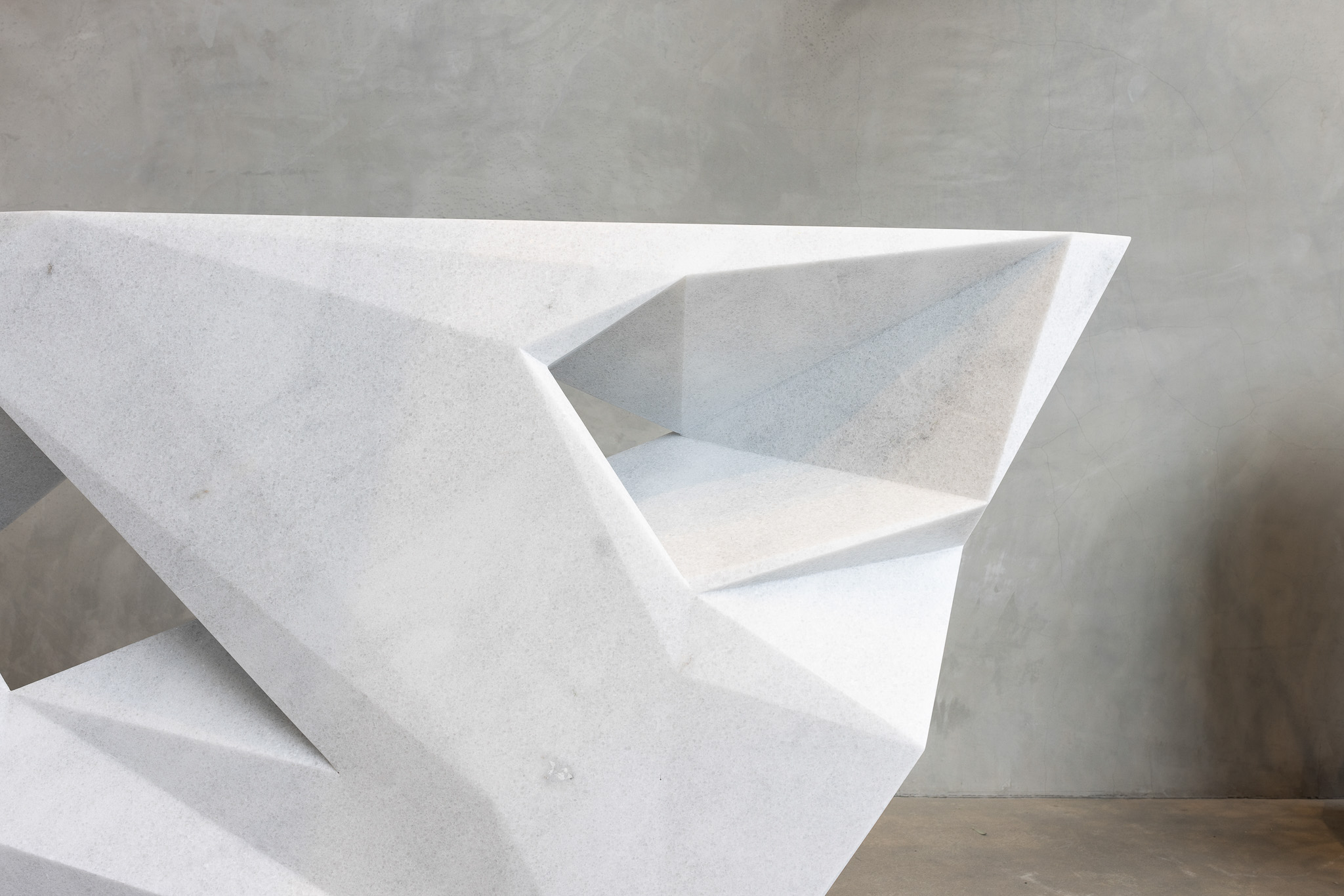 The Drift Console emerges from a single block of Naxos marble, hand-carved into a form that feels both monumental and weightless. Its geometry recalls the fractured surfaces of icebergs—massive, detached, and adrift—yet here they are suspended in stone, transformed into functional sculpture. A year in the making, each plane and angle reveals the tension between permanence and impermanence, grounding a room with both presence and poetry.